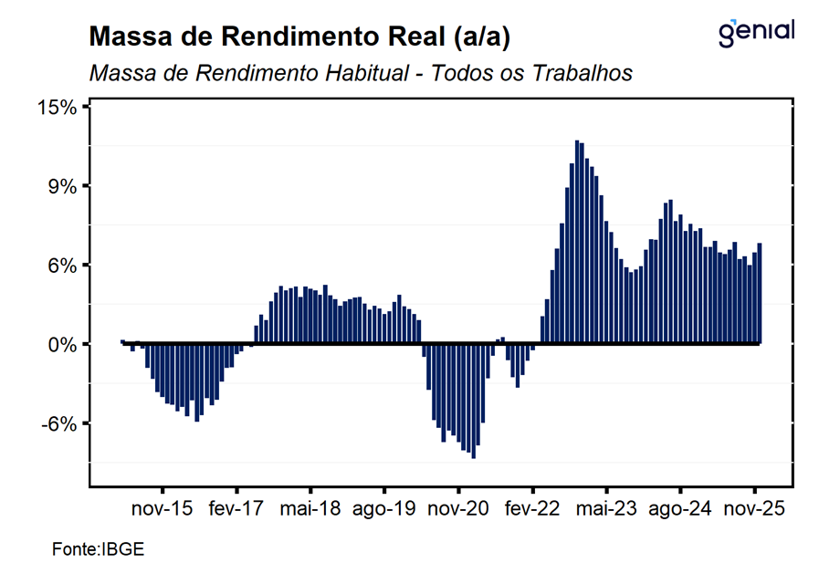 Avaliamos que os números de hoje confirmam a nossa expectativa inicial de que o mercado de trabalho encerraria 2025 com bastante robustez e resiliência, refletindo, ao nosso ver, o descasamento entre as políticas monetária e fiscal e mudanças estruturais em sua composição ao longo dos últimos anos. Em particular, os dados de dezembro, com ajuste sazonal, seguem apontando para um avanço da população ocupada ao mesmo tempo em que a força de trabalho apresentou uma certa estabilidade, sugerindo que a queda na taxa de desemprego se deu por aumento da ocupação, reforçando a percepção de robustez do resultado do mês. Para os próximos meses, alguns indicadores antecedentes começam a dar sinais de arrefecimento do mercado de trabalho, que ao nosso ver deve ocorrer de maneira bastante gradual. Ainda assim, projetamos que a taxa de desemprego permaneça significativamente abaixo do nível neutro, sustentando crescimento real elevado dos rendimentos e mantendo o mercado de trabalho como fator de desconforto para o Banco Central. Nesse contexto, os dados de hoje reforçam nossa avaliação de que o BC deverá seguir adotando uma condução cautelosa da política monetária, compatível com o início do ciclo de afrouxamento apenas em mar/26, com um corte inicial de 25 bps.