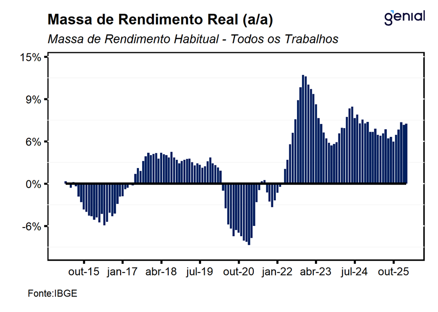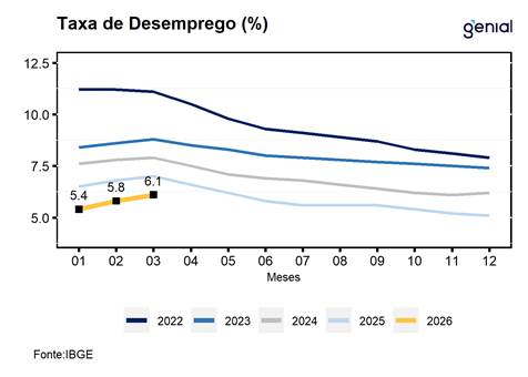 Avaliamos que os números de hoje seguem confirmando a nossa expectativa de que o mercado de trabalho seguirá bastante resiliente e robusto ao longo de 2026, apresentando um arrefecimento bastante gradual que, a nosso ver, reflete o descasamento entre as políticas monetária e fiscal, e mudanças estruturais (aplicativos e envelhecimento populacional, por exemplo) devem manter a taxa de desemprego operando abaixo do nível neutro (7,7%). Para os próximos meses, seguimos acompanhando alguns indicadores antecedentes que corroboram um cenário de arrefecimento bastante gradual do mercado de trabalho, apontando para uma ligeira elevação da taxa de desemprego na série com ajuste sazonal. Ainda assim, projetamos que a taxa de desemprego siga operando significativamente abaixo do seu nível neutro, sustentando um crescimento real elevado dos rendimentos e mantendo o mercado de trabalho como um fator de desconforto para o Banco Central. Apesar dos dados confirmarem a robustez da ocupação brasileira, estes ainda seguem corroborando a continuidade do ciclo de afrouxamento monetário por parte do BC, que deve seguir afrouxando a taxa Selic em 0,25 p.p. apesar do cenário de indefinição do conflito no Oriente Médio.