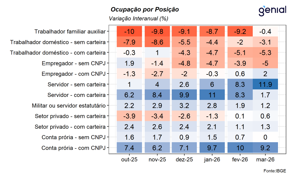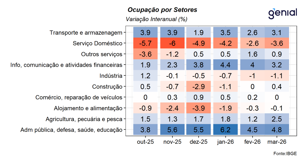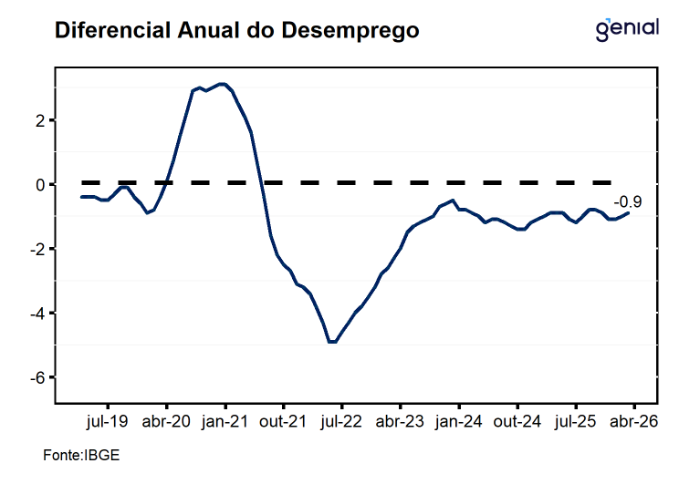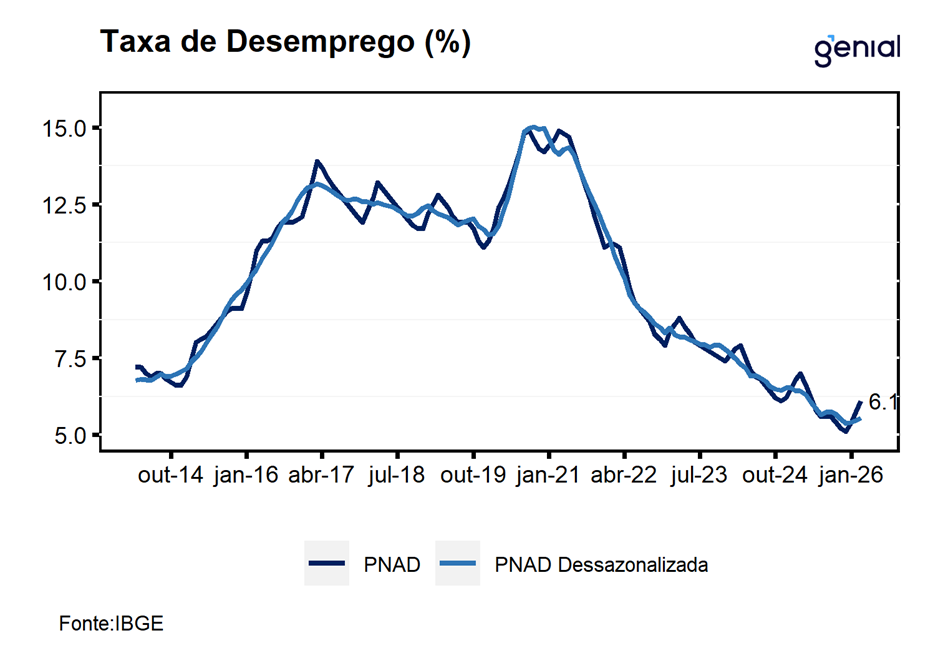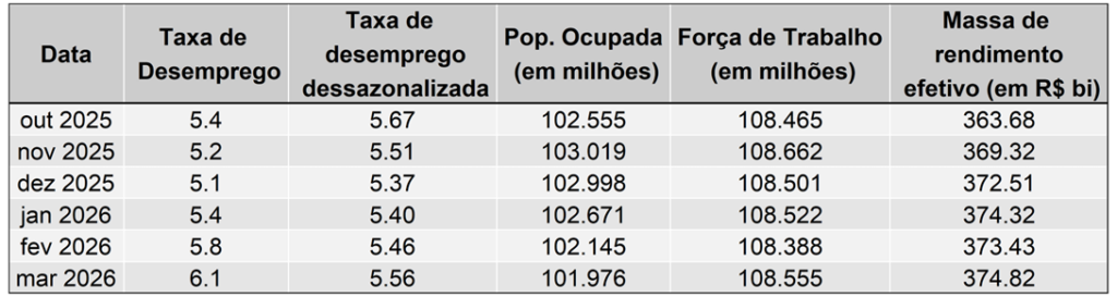 De acordo com o IBGE, a taxa de desemprego no trimestre móvel encerrado em março de 2026 foi de 6,1% da força de trabalho, resultado que ficou ligeiramente acima do consenso de mercado (6,0%, Broadcast+), porém em linha com a nossa projeção para o trimestre móvel (6,1%). Apesar do número ter vindo acima do esperado pelo mercado, avaliamos que o resultado não altera a perspectiva de lateralização do desempenho do mercado de trabalho em relação do ano passado, de modo que, a alta na taxa de desemprego, a nosso ver, é explicada em grande medida pela sazonalidade desfavorável de início de ano. Em relação ao mesmo período do ano passado, a taxa de desemprego registrou um recuo de 0,9 p.p., de modo que, o número de hoje representa o menor nível de taxa de desocupação já registrado na série histórica para um trimestre móvel encerrado em março. Na série com ajuste sazonal, a taxa de desemprego registrou uma alta de 0,1 p.p., saindo de 5,46% para 5,56%, retornando ao patamar observado em nov/25 e permanece em um patamar significativamente baixo para os padrões históricos.