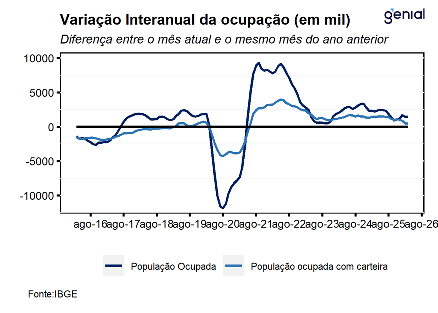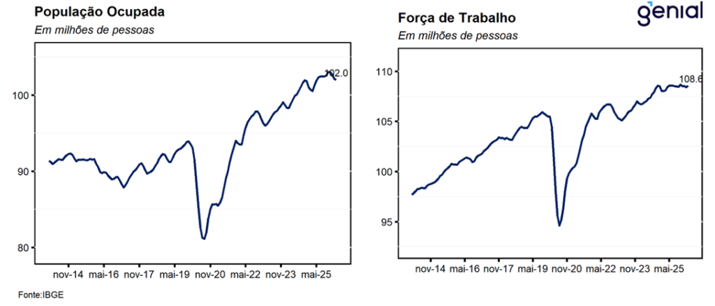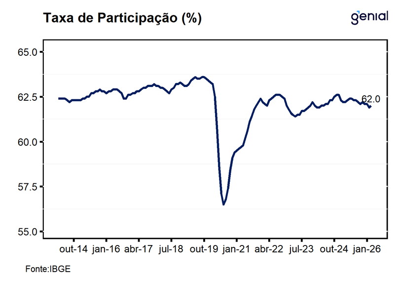 Para o próximo trimestre móvel, preliminarmente, nossos modelos sugerem que a taxa de desemprego recuará para 6,0% da força de trabalho, refletindo principalmente a dissipação da sazonalidade desfavorável de início de ano, de modo que, na série com ajuste sazonal, a taxa de desocupação deve sofrer uma ligeira alta de 5,67% da força de trabalho, permanecendo próximo ao patamar observado no último trimestre de 2025. Com os números de hoje, seguimos com a nossa expectativa de que o mercado de trabalho deve sofrer um pequeno ajuste em 2026, fazendo com que a taxa de desemprego média do ano saia de 5,9% para 6,0% da força de trabalho na passagem de 2025 para 2026.
