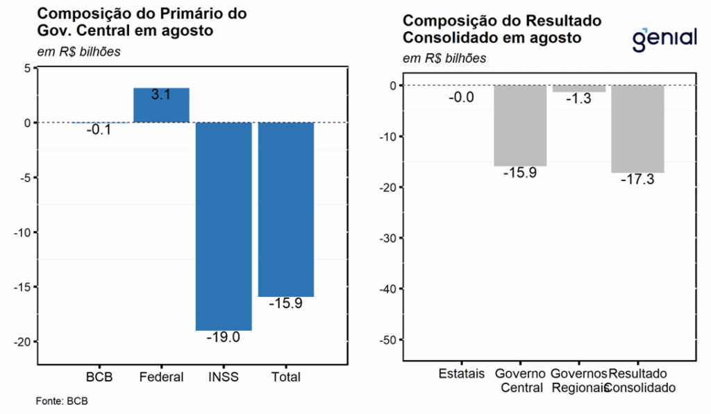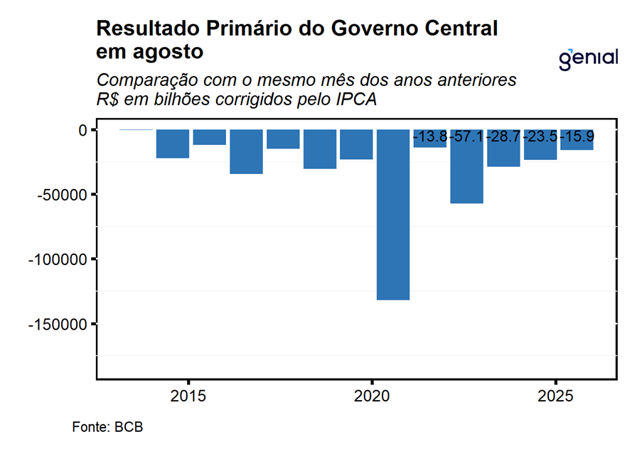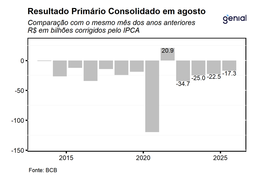 O setor público consolidado (governo central, governos regionais e empresas estatais) apresentou déficit primário de R$ 17,3 bi em agosto, vindo melhor do que o esperado pelo mercado (-R$ 19,1 bi, Broadcast+) e do que a nossa projeção para o mês (-R$ 21,9 bi). O resultado consolidado no mês foi decorrente da combinação entre os déficits primários de R$ 15,9 bi do governo central, R$ 1,3 bi dos entes subnacionais e R$ 6,0 mi das empresas estatais. O principal desvio em relação à nossa projeção para o mês ficou por conta do desempenho menos negativo do governo central, refletindo o pagamento de dividendos do BNDES, sem contraparte no mesmo período do ano anterior, impondo um viés de ligeira melhora para a nossa expectativa de déficit primário do governo consolidado para o ano de 2025.