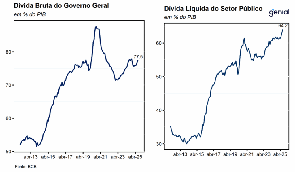 A dívida bruta do governo geral (DBGG), que engloba o Governo Federal, os Governos Regionais (estaduais e municipais) e o INSS, atingiu 77,5 % do PIB (R$ 9,6 tri), ficando estável em relação à leitura do mês imediatamente anterior. O resultado no mês foi decorrente da combinação entre os resgates líquidos de dívida (-0,2 p.p.), do efeito da valorização cambial (-0,1 p.p.), e da variação do PIB nominal (-0,5 p.p.) que compensaram o efeito dos juros nominais apropriados (0,8 p.p.). No ano, a elevação de 1,0 p.p. da DBGG como proporção do PIB decorre principalmente do crescimento do PIB nominal (-4,1 p.p.), do efeito da valorização cambial (-0,5 p.p.) e da incorporação de juros nominais (5,9 p.p.).