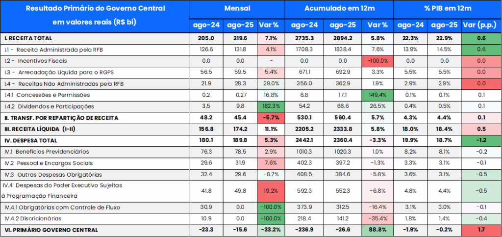O resultado nominal do setor público consolidado, que inclui o resultado primário e os juros nominais apropriados, foi deficitário em R$ 91,5 bi em agosto, ante déficit de R$ 175,6 bi em jul/25 e de déficit de R$ 90,4 bi no mesmo mês do ano anterior. No acumulado em 12 meses, o déficit nominal alcançou R$ 969,6 bi (7,81% do PIB), ante déficit de R$ 968,5,4 bi (7,85% do PIB) no mês imediatamente anterior.