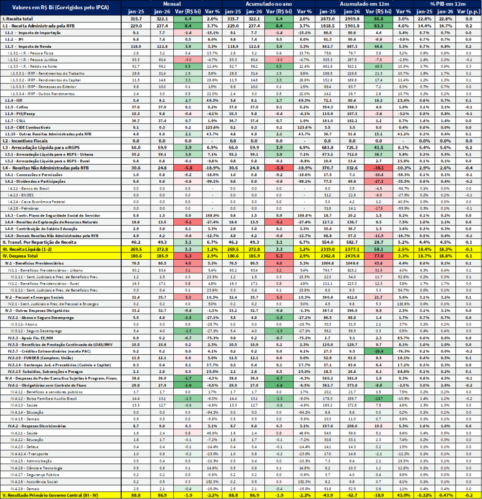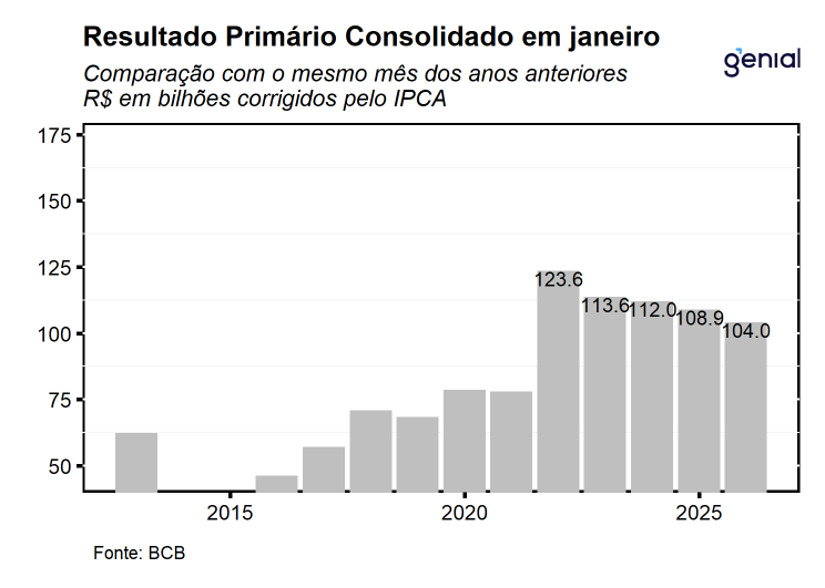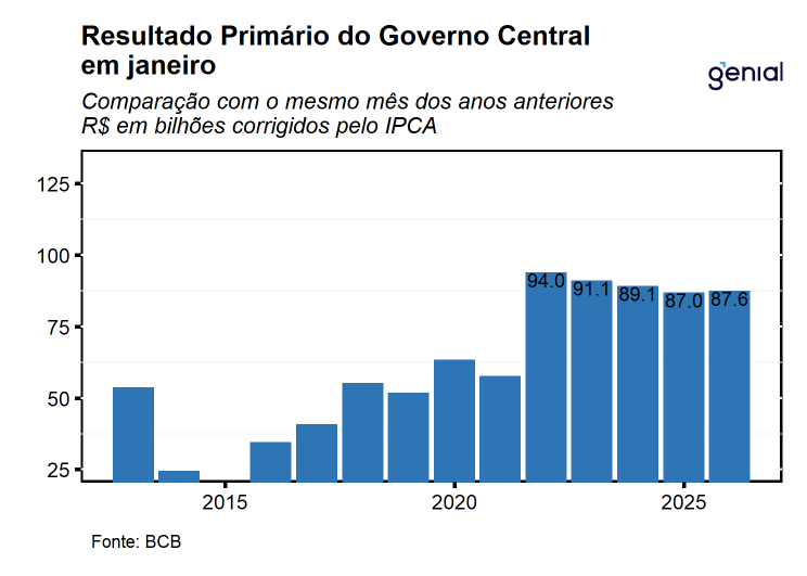Em janeiro, o governo central registrou superavit primário de R$ 86,9 bi, vindo pior do que o esperado pelo mercado (R$ 89,4 bi, Broadcast+), porém ficando mais em linha com a nossa expectativa para o mês de superávit de R$ 85,0 bi para o período. Esse resultado representa uma piora em relação ao número, corrigido pela inflação, registrado no mesmo período do ano anterior (R$ 88,8 bi), sendo reflexo da combinação entre a alta de 1,2% a/a da receita líquida (+R$ 3,3 bi) e do aumento de maior magnitude das despesas primárias totais em 2,9% a/a (+R$ 5,3 bi). Dessa forma, apesar da sazonalidade favorável de início de ano, o governo inicia 2026 com um forte ritmo de crescimento real das despesas primárias, sugerindo que o processo de ajuste fiscal brasileiro segue sendo uma tarefa bastante desafiadora.