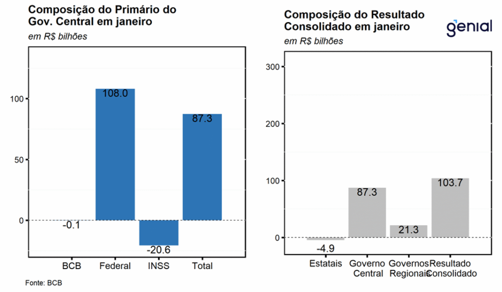 O setor público consolidado (governo central, governos regionais e empresas estatais) apresentou superávit primário de R$ 103,7 bi em janeiro, vindo melhor do que o esperado pelo mercado (R$ 102,0 bi, Broadcast+), porém mais em linha com a nossa expectativa para o mês de superávit de 103,5 bi. O resultado consolidado no mês refletiu a combinação entre os superávits de R$ 87,3 bi do Governo Central e de R$ 21,3 bi dos entes subnacionais, enquanto as empresas estatais apresentaram um déficit de R$ 4,9 bi. Esses desempenhos ficaram em linha com a nossa expectativa para o mês.