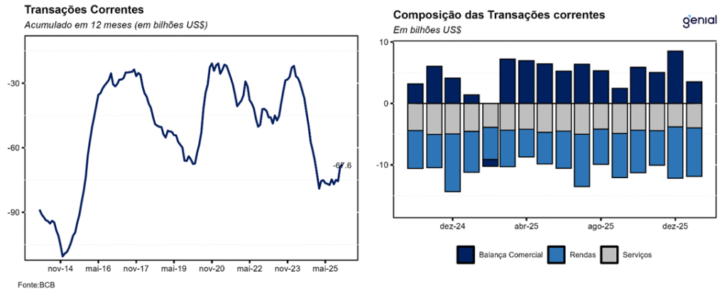 No mês de janeiro, as transações correntes do balanço de pagamentos registraram déficit de US$ 8,4 bilhões, ante resultado negativo de US$ 9,8 bilhões no início de 2025. O resultado veio abaixo do piso das estimativas dos analistas (US$ -7,7 bilhões, Broadcast+) e pior do que a nossa projeção de US$ -5,2 bilhões. No acumulado dos últimos doze meses, o resultado foi de US$ -67,6 bilhões (2,92% do PIB), e para o qual esperamos melhora até o fim de 2026 (US$ -62,0 bilhões).