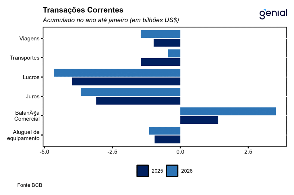 O déficit na renda primária foi de US$ 8,3 bilhões em janeiro, vindo um pouco pior do que esperávamos (US$ -6,7 bilhões), registrando uma alta de 18,7% a/a comparativamente ao déficit de US$ 7,0 bilhões do mesmo mês de 2025. Em doze meses, o déficit dessa balança atingiu US$ 82,7 bilhões, resultado que deve melhor um pouco e encerrar 2026 no patamar de US$ -80,0 bilhões. As despesas líquidas de lucros e dividendos associadas aos investimentos direto e em carteira totalizaram US$ 4,7 bilhões em janeiro, ante US$ 4,0 bilhões no mesmo mês de 2025, uma alta de 16,8% a/a que fez com que o déficit registrado no acumulado dos últimos doze meses fosse de US$ 54,3 bilhões, patamar próximo do qual deve encerrar o ano (US$ 52,0 bilhões). Por sua vez, as despesas líquidas com juros somaram US$ 3,7 bilhões no período, uma elevação de 18,3% a/a, com o déficit atingindo US$ 28,7 bilhões nos últimos doze meses.