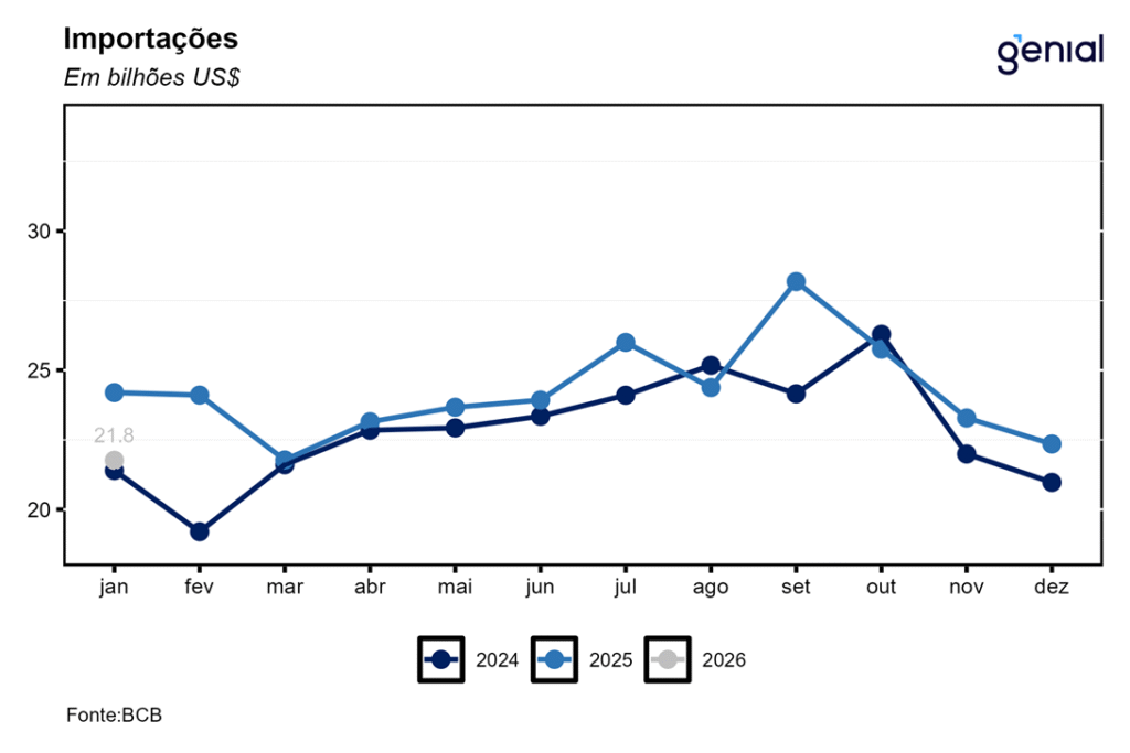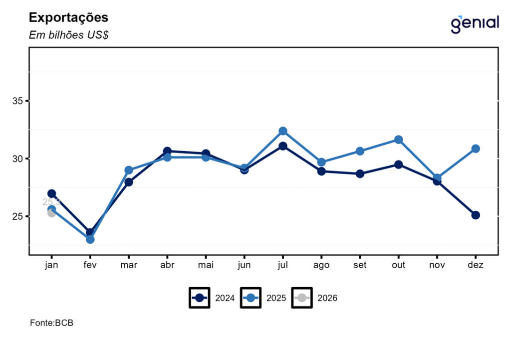 No que se refere à balança comercial de bens, foi registrado um superávit de US$ 3,5 bilhões em janeiro, mais do que o dobro do US$ 1,4 bilhão registrados no mesmo mês de 2025, o que contribuiu para que o superávit da balança comercial encerrasse nos últimos doze meses atingisse R$ 61,8 bilhões. Para 2026, projetamos um superávit de US$ 68,5 bilhões. Agora em janeiro, as importações atingiram US$ 21,8 bilhões, uma queda de 10,0% a/a, o que indica uma economia em processo de acomodação nesse início de ano, embora ainda aquecida. As exportações também apresentaram redução na métrica interanual (-1,2% a/a), alcançando o patamar de US$ 25,3 bilhões. Para 2026, esperamos US$ 355,5 de exportações e US$ 287,0 bilhões de importações.