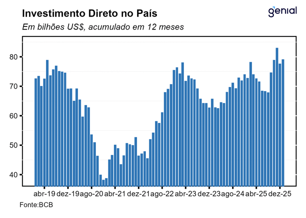 No tocante a conta financeira, o Investimento Direto no País (IDP) totalizou saídas líquidas de US$ 8,2 bilhões em janeiro, resultado que ficou próximo do teto das estimativas dos analistas de mercado (US$ 8,3 bilhões, Broadcast+) e acima da nossa projeção US$ 6,6 bilhões. Com isso, o IDP nos últimos doze meses atingiu US$ 79,1 bilhões (3,42% do PIB), patamar muito próximo do qual esperamos que ele encerre o ano de 2026 (US$ 79,3 bilhões). A queda no déficit em conta corrente e o aumento do IDP contribuíram para tirar um pouco da pressão sobre as contas externas brasileiras, embora o fato de o déficit em transações corrente ter o IDP como principal fonte de financiamento ainda impeça um distensionamento mais expressivo. Analisando a composição do IDP, a maior contribuição veio novamente do item de participação no capital (US$ 6,9 bilhões), com US$ 3,3 bilhões oriundos de participação no capital (ex lucros reinvestidos) e US$ 3,6 bilhões de lucros reinvestidos, enquanto as operações intercompanhia registraram entradas líquidas de US$ 1,3 bilhão.