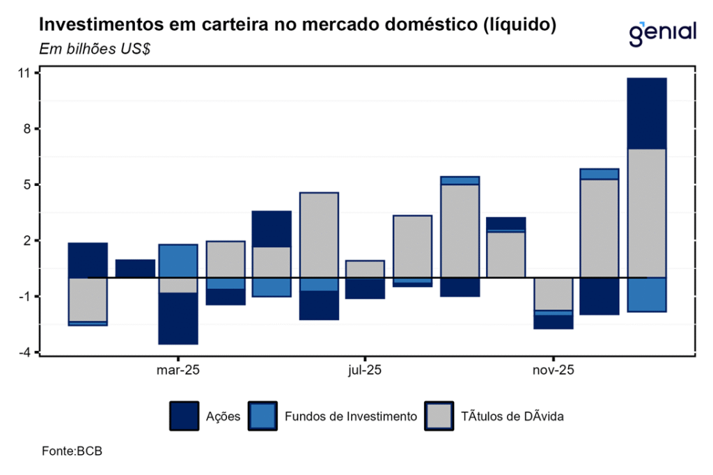 Os investimentos em carteira no mercado doméstico registraram os seguintes fluxos associados as 3 principais categorias de investimento em janeiro: ativos de renda fixa (US$ 6,939 bilhões), fundos (US$ -1,824 bilhão) e ações (US$ 3,752 bilhões). O resultado líquido bem promissor de janeiro (US$ 8,867 bilhões) se deu pelo movimento de diversificação global que ganhou novo folego nesse início de ano por conta do aumento da incerteza acerca das políticas econômica, comercial e externa dos Estados Unidos. Isso intensificou os fluxos de recursos para países emergentes, com o Brasil sendo um dos mais favorecidos.