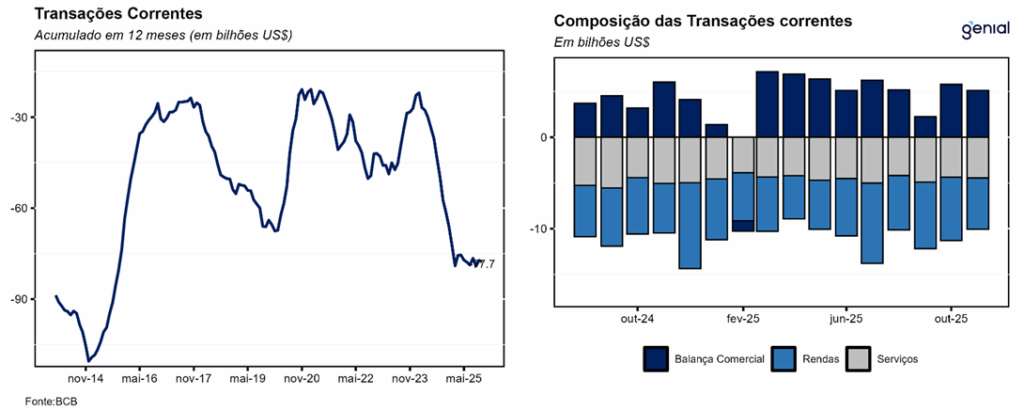 No mês de novembro, as transações correntes do balanço de pagamentos registraram déficit de US$ 4,9 bilhões, ante resultado negativo de US$ 4,4 bilhões no mesmo mês de 2024. O resultado veio um pouco melhor do que a mediana das projeções de mercado (US$ -5,05 bilhões, Broadcast+) e a nossa projeção (US$ -5,4 bilhões). Nos últimos doze meses o resultado foi de US$ -77,7 bilhões (3,47% do PIB), consideravelmente pior do que o registrado no mesmo período de 2024 (US$ -61,5 bilhões; 2,78% do PIB).