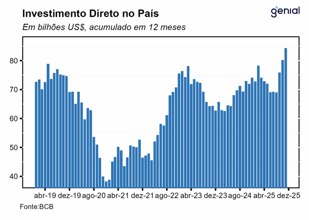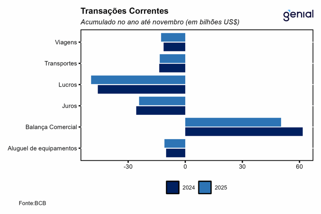 O déficit em renda primária foi de US$ 6,2 bilhões em novembro, vindo marginalmente melhor do que esperávamos (US$ -6,5 bilhões) e registrando uma alta de 6,4% a/a comparativamente ao déficit de US$ 5,8 bilhões do mesmo mês de 2024. Em 12 meses, o déficit da balança de renda primária foi de US$ 83,4 bilhões. As despesas líquidas de lucros e dividendos associadas aos investimentos direto e em carteira totalizaram US$ 4,8 bilhões em novembro, ante US$ 4,3 bilhões no mesmo mês de 2024, um avanço de 13,3% a/a. Por sua vez, as despesas líquidas com juros somaram US$ 1,4 bilhão no período, uma queda expressiva de 13,4% a/a.