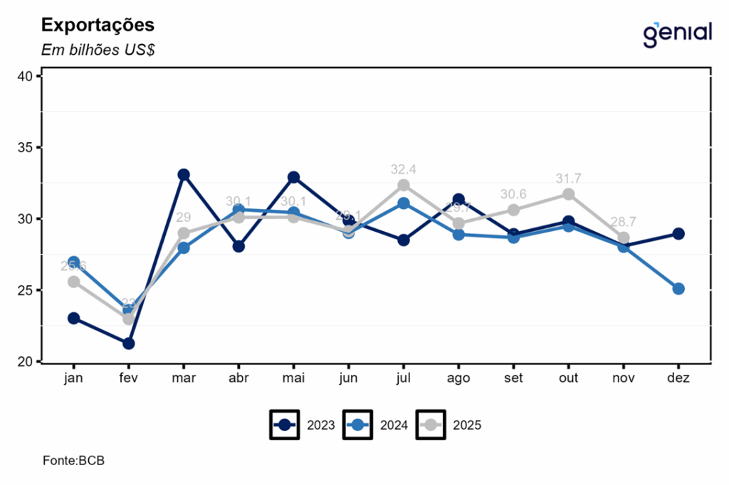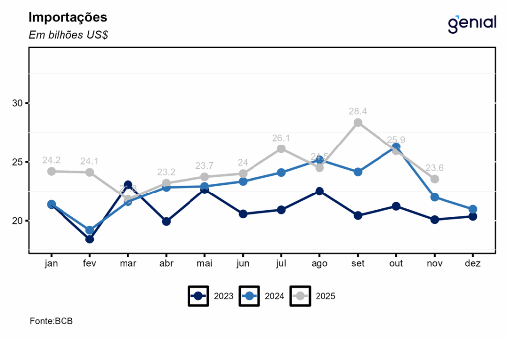 No que se refere à balança comercial de bens, foi registrado um superávit de US$ 5,1 bilhões em novembro, um pouco abaixo da nossa projeção de US$ 5,4 bilhões e dos US$ 6,0 bilhões do mesmo mês do ano passado. As importações atingiram US$ 23,6 bilhões, apresentando uma alta de 7,1% a/a, o que indica uma economia ainda aquecida, com a forte absorção doméstica levando a menor superávits da balança comercial. Já as exportações se expandiram apresentaram alguma acomodação, com o crescimento desacelerando de 7,6% a/a para 2,3% a/a, totalizando US$ 28,7 bilhões.