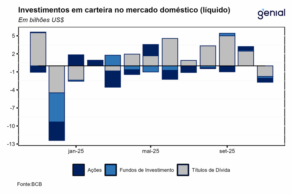 Em novembro, os investimentos em carteira no mercado doméstico registraram os seguintes fluxos associados as 3 principais categorias de investimento: ativos de renda fixa (US$ -1,763 bilhões), fundos (US$ -290 milhões) e ações (US$ -670 milhões). O resultado líquido de US$ -2,723 bilhões pode ser explicado pela reforma tributária, mais especificamente a introdução da tributação sobre dividendos, que acabou gerando o incentivo para as firmas estrangeiras aqui instaladas repatriarem os lucros para os seus respectivos países de origem antes da promulgação da nova legislação sobre o tema. Vale destacar que esse resultado negativo para o mês de novembro ocorreu num cenário no qual o “Carry to Vol” ainda estava favorável, com o diferencial de juros entre o Brasil e os EUA aumentando e com uma volatilidade baixa do real.