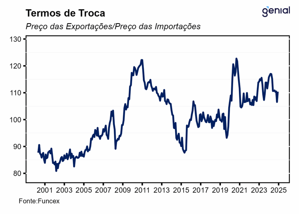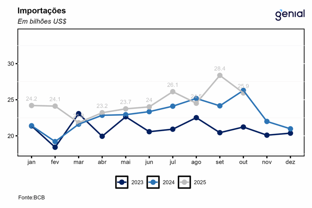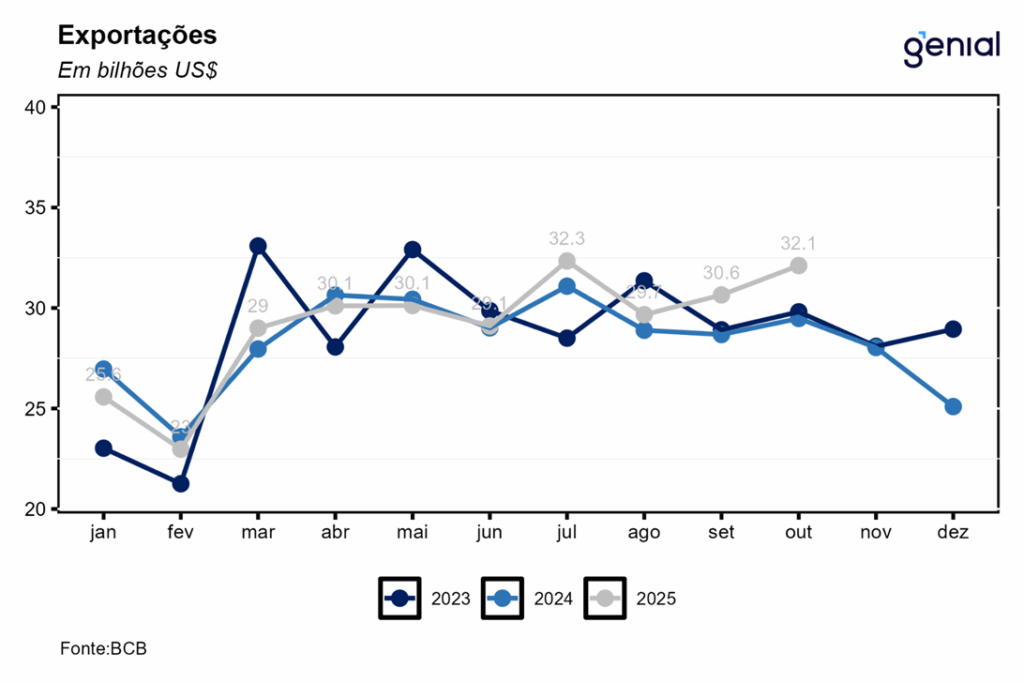 No que se refere à balança comercial de bens, foi registrado um superávit de US$ 6,2 bilhões em outubro, muito próximo da nossa projeção de US$ 6,4 bilhões e bem acima dos US$ 3,2 bilhões do mesmo mês do ano passado. As importações atingiram US$ 25,9 bilhões, apresentando uma queda de -1,3% a/a na esteira dos sinais incipientes de desaceleração da atividade econômica doméstica. Já a exportações se mantiveram em trajetória de recuperação, voltando para o mesmo patamar de julho (período anterior ao “tarifaço” de 50% aplicado pelos EUA sobre o Brasil), totalizando US$ 32,1 bilhões.