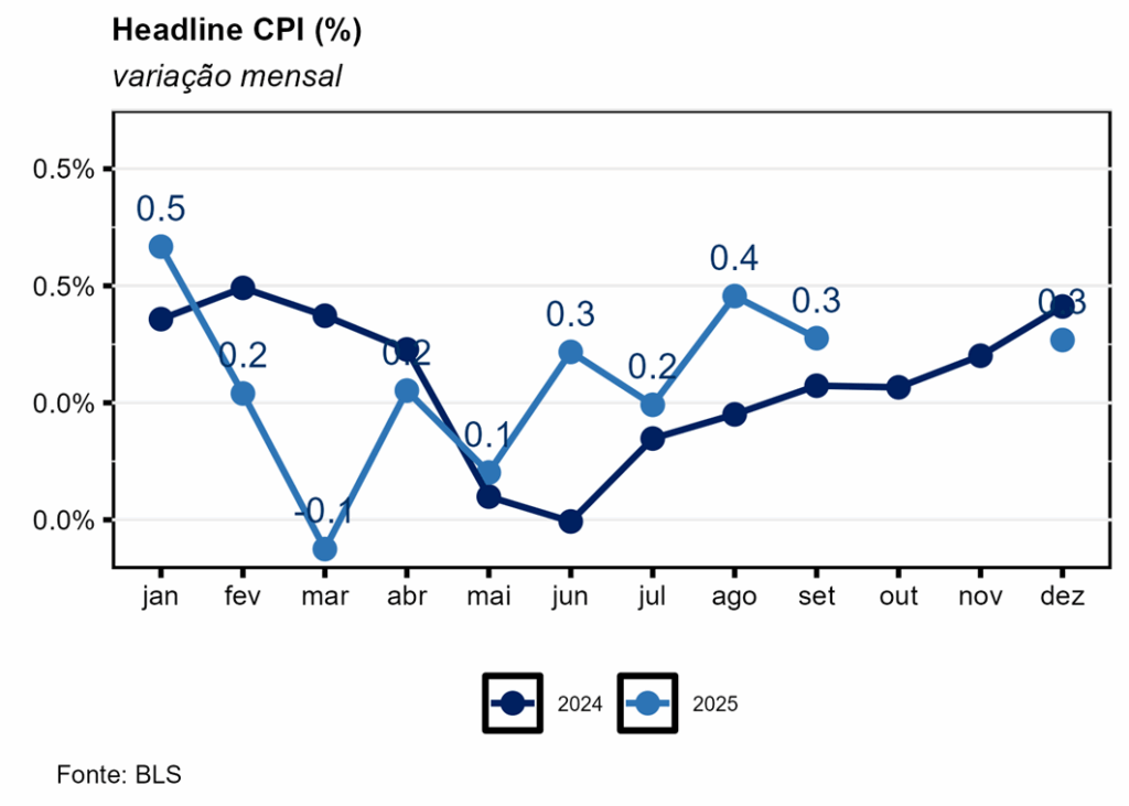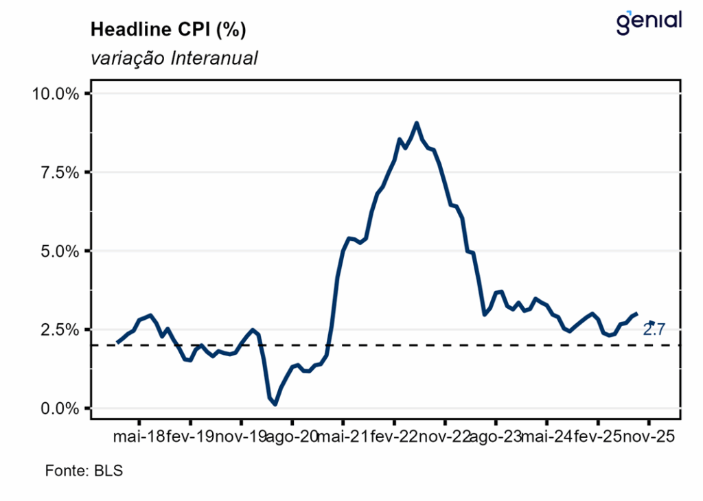 O índice de preços ao consumidor (CPI) dos EUA veio em linha com o esperado pelo mercado (0,3% m/m, Bloomberg), mas acima da nossa projeção (0,19% m/m), registrando variação de 0,31% m/m em dezembro. Com isso, a inflação acumulada em doze meses arrefeceu para 2,68% a/a, indo ao encontro das projeções de mercado (2,7% a/a), mas ficando novamente aquém da nossa (2,78% a/a).