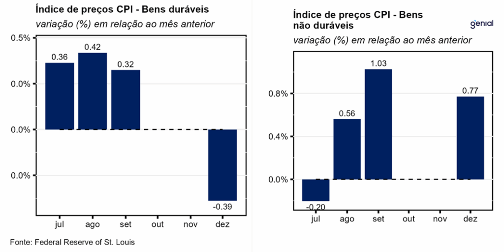 Em dezembro, a inflação de serviços voltou a rodar no mesmo patamar mensal elevado visto em agosto (0,33% m/m), o que impediu o arrefecimento da métrica anual (3,25% a/a, ante 3,23% a/a). Dentre a categoria de bens, os duráveis registraram em dezembro a maior deflação do ano (-0,39% m/m), o que fez com que a métrica anual saísse de 1,46% a/a para 1,21% a/a. Já o segmento de não duráveis registrou forte aumento de preços, deixando para trás o avanço de 0,16% m/m e passando a registrar alta de 0,77% m/m. Contudo, no acumulado em doze meses a taxa de variação recuou de 2,01% a/a para 1,86% a/a.