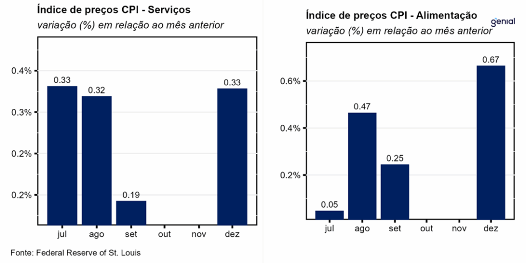 Dentre os principais grupos, os aluguéis (Shelter) registraram alta de 0,4% m/m em dezembro, respondendo pela maior parcela da alta do CPI cheio do mês. Já os alimentos apresentaram um crescimento expressivo de 0,7% m/m no mesmo período devido a altas dessa mesma magnitude nos segmentos de alimentação no domicílio e fora do domicílio. Nos doze meses encerrados em dezembro observou-se uma alta de 4,1% a/a na alimentação fora do domicílio, 2,4% a/a na alimentação no domicílio e 3,1% a/a na alimentação em geral.