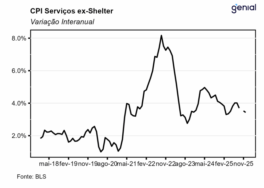 No geral, vale destacar que apesar do CPI cheio ter vindo em linha com o esperado e o núcleo ter surpreendido para baixo, os dados de dezembro ainda estavam de certa forma contaminados pelo efeito base do período, que contemplou uma época na qual o shutdown do governo ainda vigorava, prejudicando a coleta de preços. Além disso, a surpresa baixista no núcleo do CPI veio em decorrência basicamente da deflação registrada no item de carros e caminhões usados. Esses fatores, aliado com a escalada dos embates entre o governo e o banco central norte americano (Federal Reserve) devem reforçar a postura de cautela da autoridade monetária nesse início de ano, com os juros sendo mantidos inalterados nesse 1º trimestre.