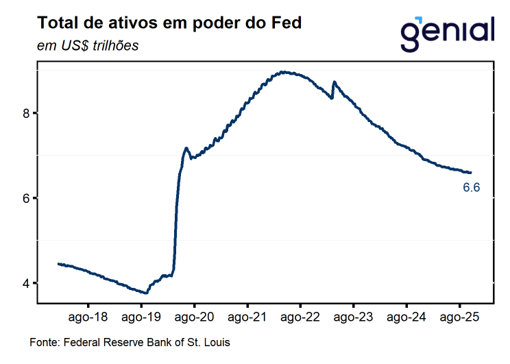 O comunicado trouxe poucas alterações em relação ao comunicado anterior, mas de modo geral segue buscando ressaltar os riscos em cumprir tanto o objetivo de promover a estabilidade de preços quanto de pleno emprego, destacando que os riscos de enfraquecimento do mercado de trabalho superam os de inflação. Outro destaque ficou por conta do anúncio do fim do Quantitative Tighetening (QT) a partir do dia 01 de dezembro, ficando em linha com as falas anteriores do presidente Jerome Powell que indicavam o fim do processo ao longo dos próximos meses e reforçam a percepção de que o atual nível de reservas bancárias se encontra próximos do nível desejado pelo Fed em meio aos recentes episódios de aperto das condições no mercado interbancário.