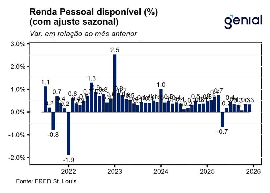 A renda pessoal (personal income) avançou 0,33% m/m em dezembro, vindo ao encontro do que o mercado esperava (0,3% m/m, Bloomberg), mas um pouco abaixo do esperado por nós (0,38% m/m). Já a renda pessoal disponível (disposable personal income) apresentou variação idêntica (0,33% m/m) no período. Isso se deu pelo fato de a alta dos impostos pessoais correntes (personal current taxes) ter desacelerado consideravelmente na virada de novembro para dezembro, saindo de 0,62% m/m para 0,32% m/m. Por sua vez, a renda pessoal disponível em termos reais voltou a apresentar variação negativa, saindo de 0,12% m/m, ante -0,03% m/m.