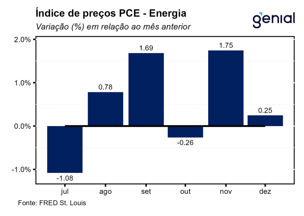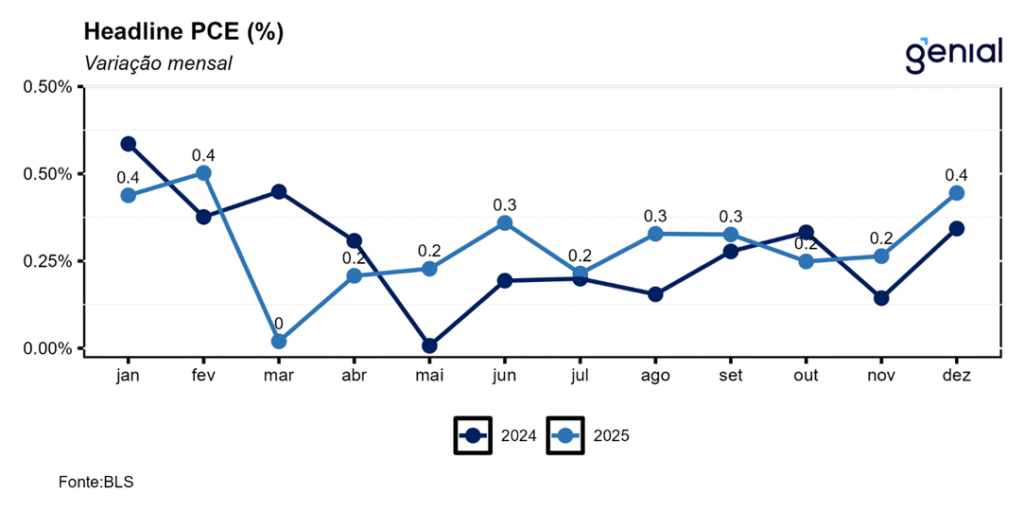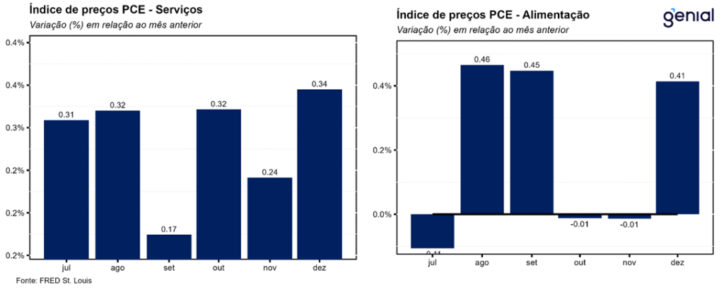 Em relação ao índice de preços de gastos com consumo (PCE price index), o índice cheio apresentou variação de 0,36% m/m em dezembro, superando tanto a projeção do mercado (0,3% m/m, Bloomberg) como a nossa (0,25% m/m). Com isso, a métrica em 12 meses acelerou consideravelmente, saindo de 2,82% a/a para 2,90% a/a, superando as expectativas de permanência em 2,8% a/a. Já o núcleo, que desconsidera alimentos e energia, registrou aceleração parecida, saindo de 0,17% m/m para 0,36% m/m no mesmo período, também ficando além do que o mercado esperava (0,3% m/m, Bloomberg). O mesmo ocorreu com o cômputo interanual, que saltou mais do que o previsto (de 2,83% a/a para 3,00% a/a, ante expectativa de 2,90% a/a).