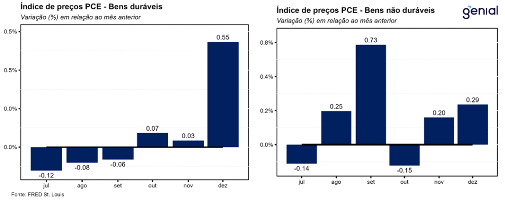 Dessa vez, a composição mostrou trajetórias similares entre a inflação de bens e a de serviços. Enquanto a primeira saiu de 0,14% m/m para 0,38% m/m na passagem de novembro para dezembro por conta da forte alta na inflação de bens duráveis (0,55% m/m, ante 0,03% m/m), a segunda registrou uma aceleração de 0,24% m/m para 0,34% m/m. Com isso, a inflação de bens na métrica anual saiu de 1,46% a/a para 1,74% a/a, ao passo que a de serviços permaneceu praticamente inalterada (3,43% a/a, ante 3,44% a/a).