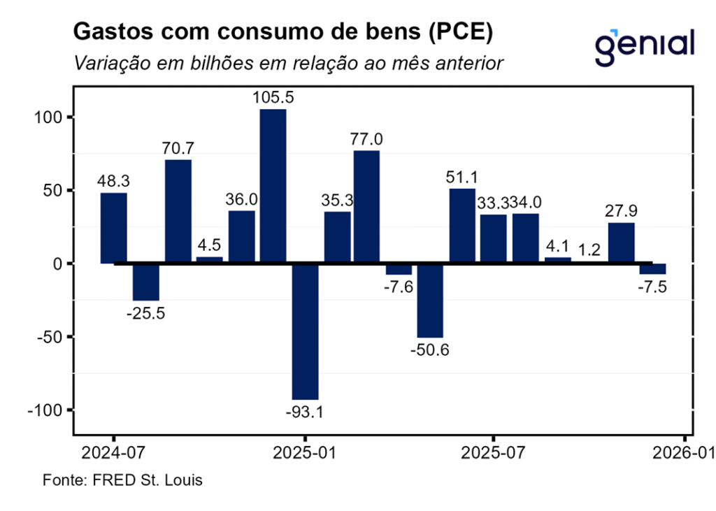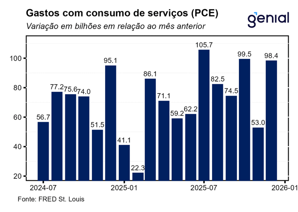 Os gastos com consumo pessoal (personal consumption expenditures) registraram aceleração na passagem de novembro para dezembro, saindo de 0,38% m/m para 0,43% m/m, movimento contrário do antecipado pelo mercado, que esperava uma desaceleração para 0,3% m/m (Bloomberg), e por nós, que tínhamos uma acomodação para 0,36% m/m. Em termos reais, a taxa de variação dos gastos com consumo pessoal (real personal consumption expenditures) não surpreendeu, vindo em linha com o consenso (0,07% m/m vs. 0,1% m/m).