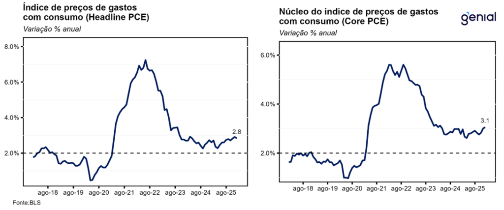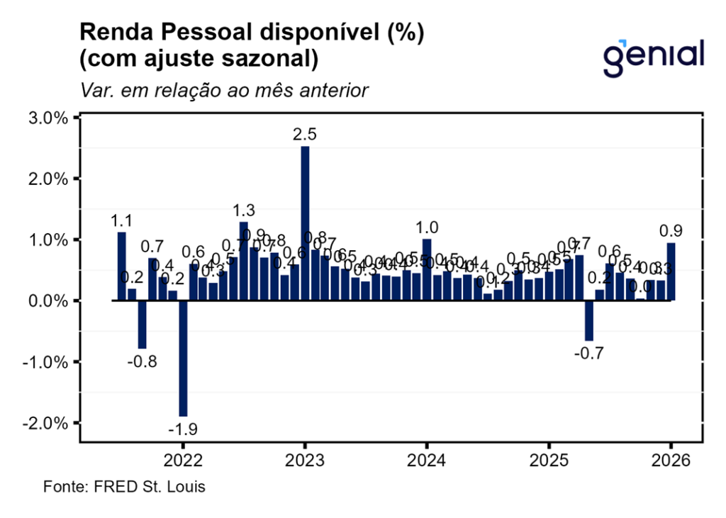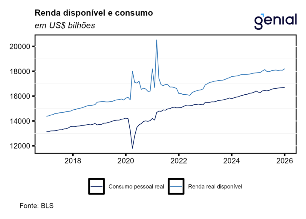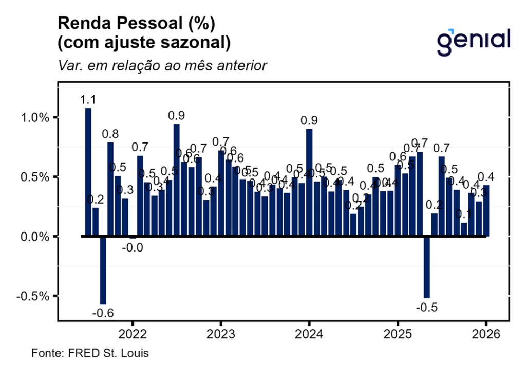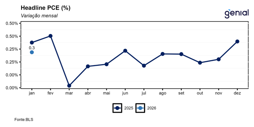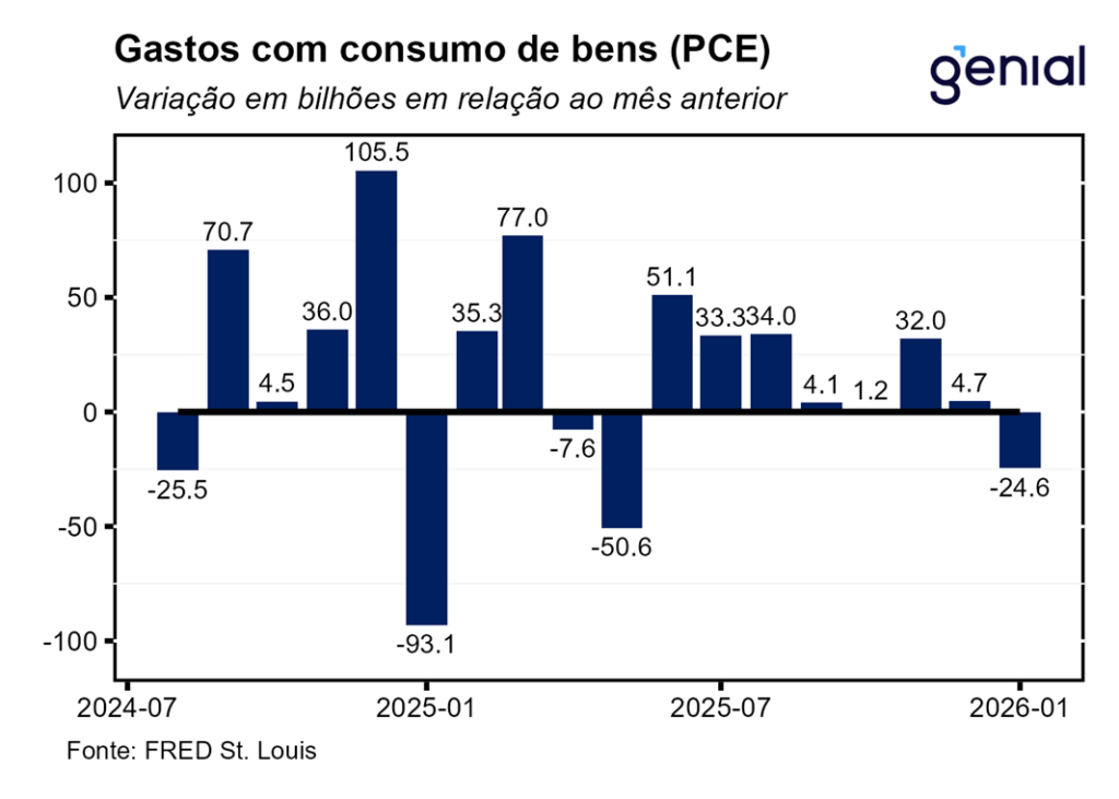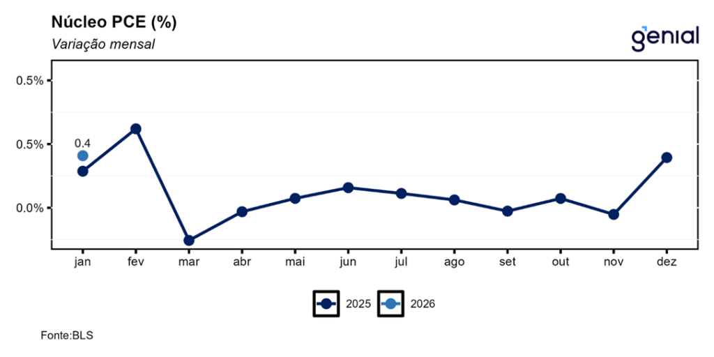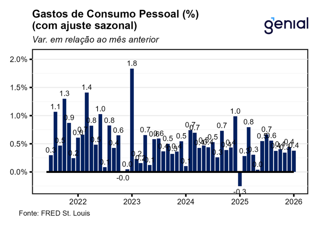 A segunda leitura do PIB do 4º trimestre de 2025 foi revisada de 1,4% t/t para 0,7% t/t em termos anualizados, surpreendendo o mercado que esperava a continuidade do número da primeira prévia. O mesmo aconteceu com a métrica de consumo pessoal, que saiu de 2,4% t/t para 2,0% t/t enquanto a expectativa de confirmação da alta de 2,4% t/t da 1ª prévia. Isso mostra que o fato de os funcionários públicos tendo ficado sem receber salário no período do shutdown do governo pesou sobre o consumo agregado, diferentemente do que se achava com a divulgação da primeira leitura do dado, que as ferramentas de crédito tinham sido eficazes para suavizar o consumo dessa parcela da população. Contudo, a despeito dessa atividade econômica mais fraca do que o previamente antecipado, o índice de preços de gastos com consumo (PCE price index) foi revisado de 3,6% t/t para 3,8% t/t ante perspectiva de ficar inalterado, ao passo que o núcleo do PCE permaneceu em 2,7% t/t, repetindo a alta da leitura anterior.