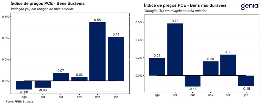 Dessa vez, a composição mostrou trajetórias divergentes entre a inflação de bens e a de serviços. Enquanto a primeira despencou de 0,38% m/m para apenas 0,05% m/m na passagem de dezembro para janeiro muito por conta de uma inflexão nos preços dos bens não duráveis (-0,15% m/m, ante 0,30% m/m), embora a inflação dos bens duráveis também tenha arrefecido (0,41% m/m, ante 0,55% m/m), a segunda registrou uma aceleração de 0,35% m/m para 0,38% m/m. Com isso, a inflação de bens na métrica anual saiu de 1,74% a/a para 1,29% a/a, ao passo que a de serviços saltou de 3,44% a/a para 3,54% a/a.