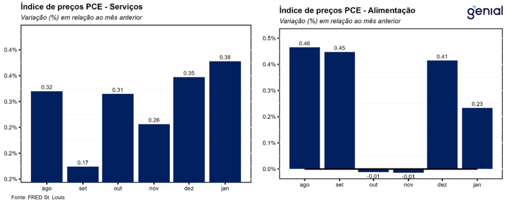 Em relação ao índice de preços de gastos com consumo (PCE price index), o índice cheio apresentou variação de 0,28% m/m em janeiro, vindo alinhado tanto com consenso de mercado (0,3% m/m, Bloomberg) como com a nossa (0,31% m/m). Já no acumulado em 12 meses a desaceleração foi maior do que a antecipada, saindo de 2,91% a/a para 2,83% a/a quando o mercado esperava manutenção em 2,9% a/a e nós uma leve aceleração para 2,95% a/a. Já o núcleo, que desconsidera alimentos e energia, repetiu a alta de dezembro (0,36% m/m), ficando próximo do que o mercado esperava (0,4% m/m, Bloomberg) e um pouco abaixo do que projetávamos (0,45% m/m). Já no cômputo interanual, a alta saiu de 3,01% a/a para 3,06% a/a, ficando em linha com o que os analistas e nós prevíamos (3,10% a/a).