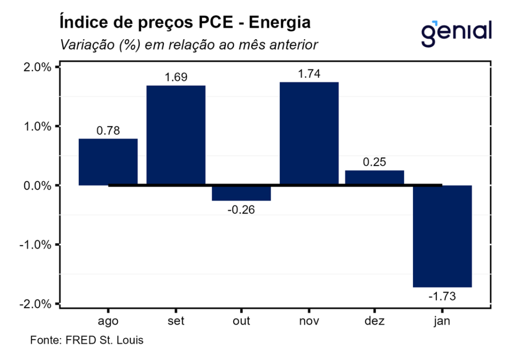 Os gastos com consumo pessoal (personal consumption expenditures) registraram um leve arrefecimento na passagem de dezembro para janeiro, saindo de 0,44% m/m para 0,38% m/m, num movimento mais lento do que o esperado pelo mercado, que tinha uma expectativa de 0,3% m/m (Bloomberg), mas mais em linha com o que esperávamos (0,40% m/m). Em termos reais, a taxa de variação dos gastos com consumo pessoal (real personal consumption expenditures) surpreendeu um pouco para cima (0,10% m/m vs. 0,0% m/m).