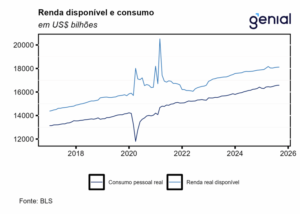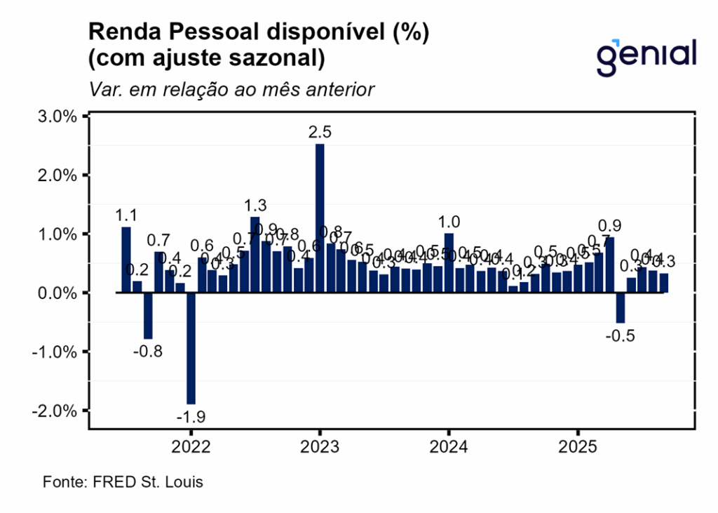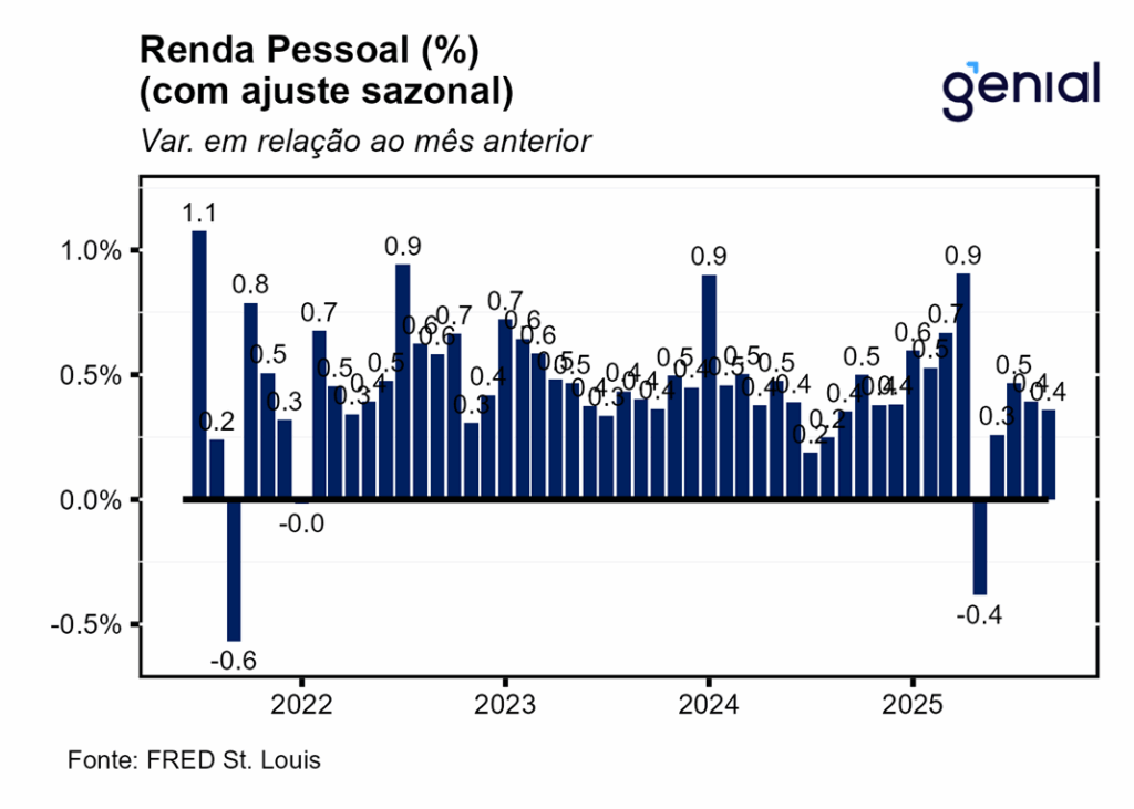 A renda pessoal (personal income) avançou 0,36% m/m em setembro, em acima do esperado pelo mercado (0,3% m/m, Bloomberg), mas em linha com a nossa estimativa (0,37% m/m). Já a renda pessoal disponível (disposable personal income) apresentou variação levemente inferior (0,33% m/m) no período. Isso se deu pelo fato de a alta dos impostos pessoais correntes (personal current taxes) ter acelerado na passagem de agosto para setembro, saindo de 0,53% m/m para 0,57% m/m.
