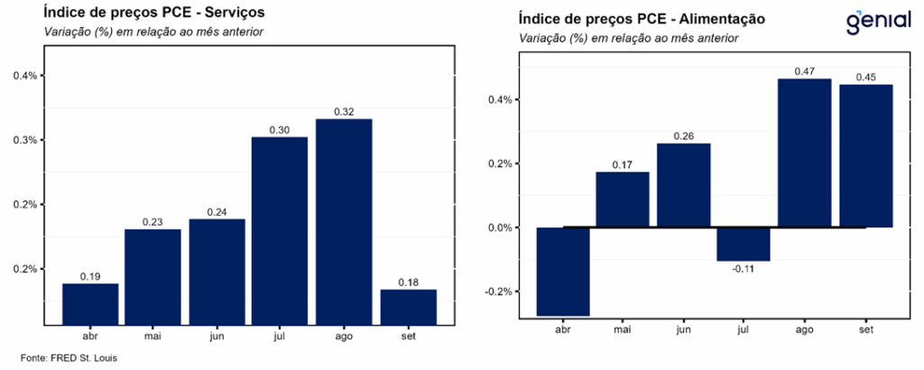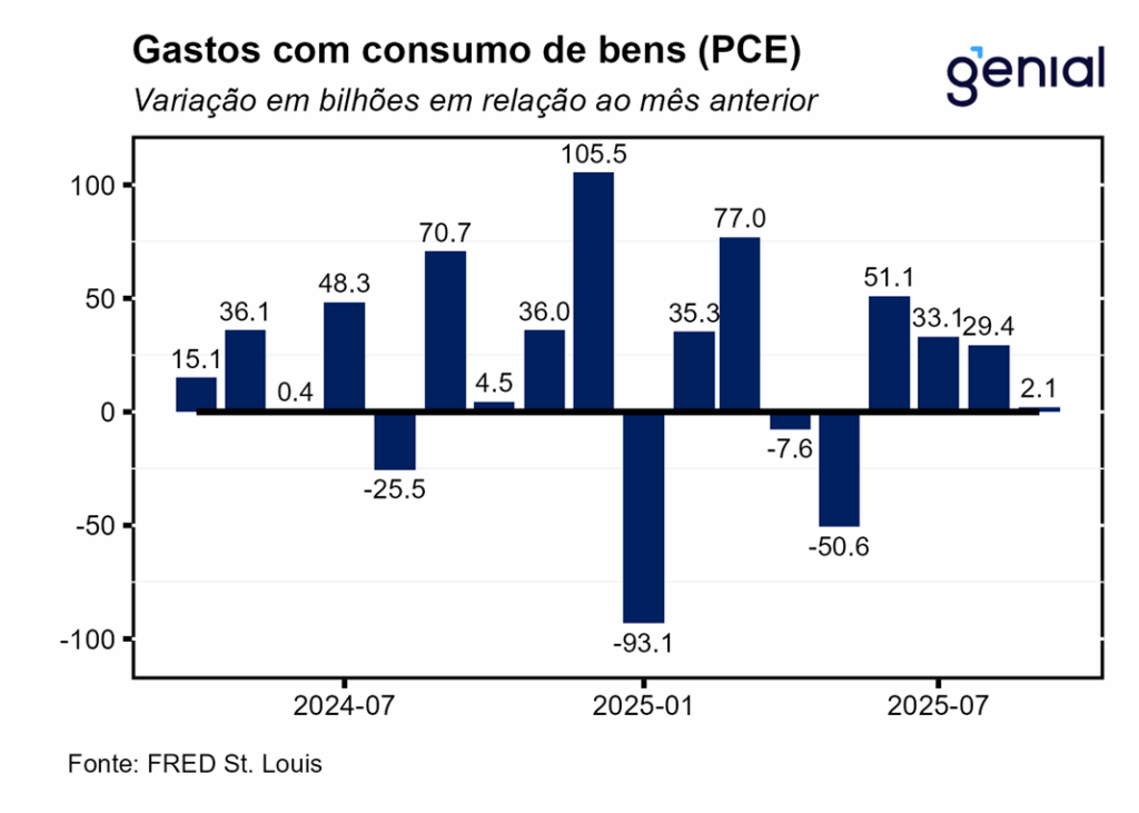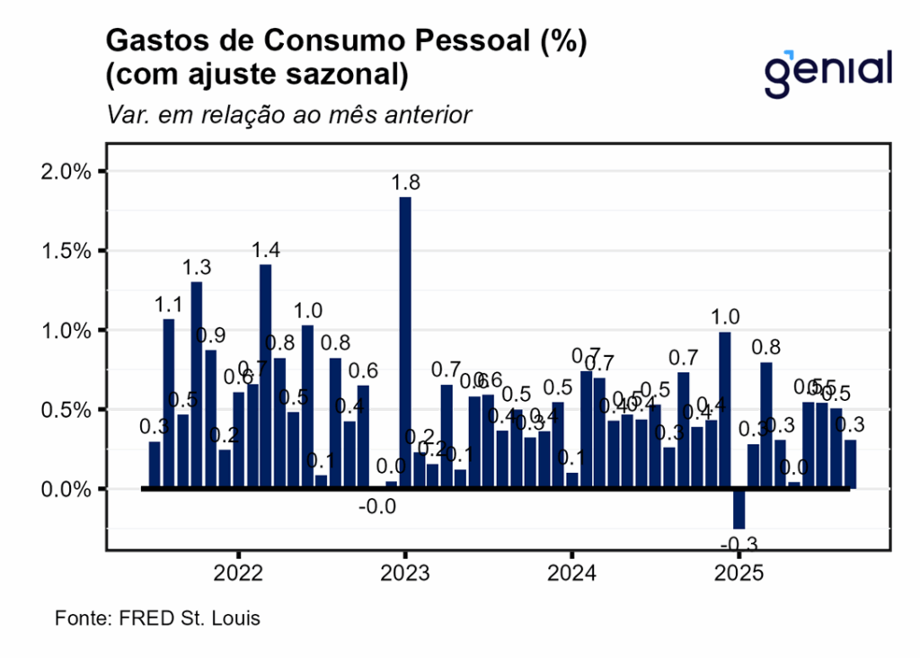 Os gastos com consumo pessoal (personal consumption expenditures) registraram desaceleração na passagem de agosto para setembro, saindo de 0,50% m/m para 0,31% m/m, ficando aquém do consenso de mercado (0,4% m/m, Bloomberg), mas vindo ao encontro da nossa projeção (0,33% m/m). Em termos reais, a taxa de variação dos gastos com consumo pessoal (real personal consumption expenditures) também apresentou crescimento abaixo do esperado em setembro (0,0% m/m vs. estimativas de 0,1% m/m). Na mesma direção, a renda pessoal disponível em termos reais foi de 0,06% m/m, ante 0,11% m/m.