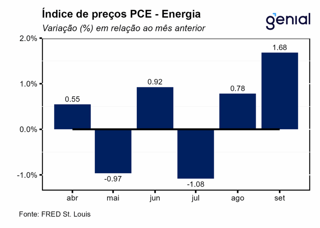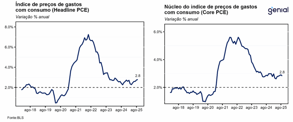 Em relação ao índice de preços de gastos com consumo (PCE price index), o índice cheio apresentou variação de 0,27% m/m, marginalmente acima da nossa projeção (0,25% m/m) e em linha com a expectativa do mercado (0,3% m/m, Bloomberg), enquanto a métrica em 12 meses acelerou, saindo de 2,74% a/a para 2,79% a/a, próximo ao esperado por nós (2,77% a/a) e pelo mercado (2,8% a/a). Já o núcleo ex-energia e alimentos avançou 0,20% m/m, vindo marginalmente aquém do que esperávamos (0,23% m/m) e em linha com o previsto pelo mercado (0,2% m/m). Em 12 meses, a alta de 2,83% a/a veio ao encontro da nossa projeção (2,84% a/a) e em linha com o consenso de mercado (2,8% a/a).
