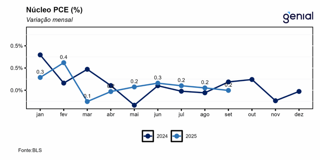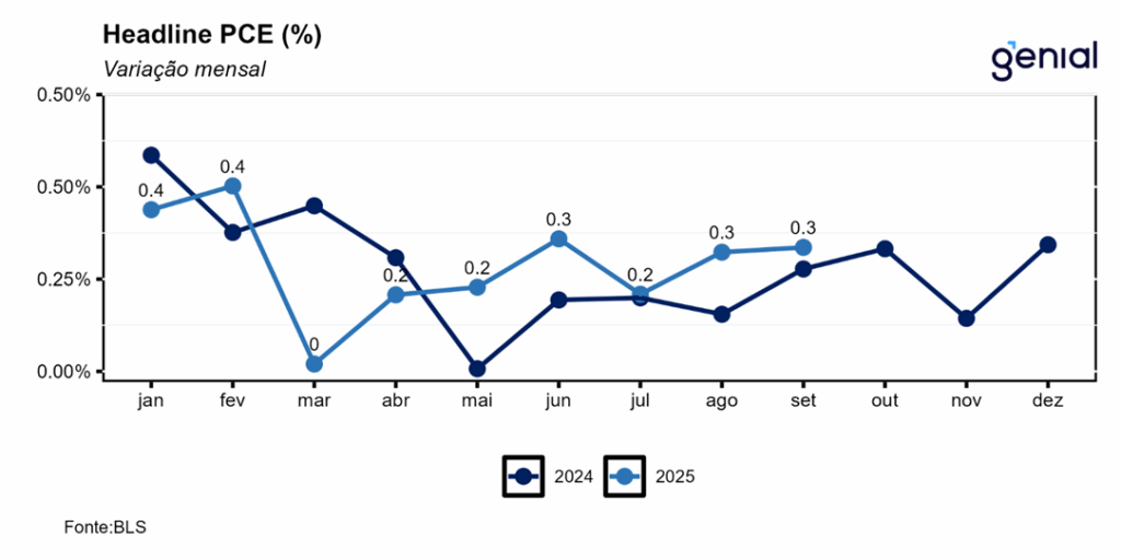 Mesmo com a inflação de setembro medida pelo PCE não tendo apresentado surpresas, isso não deve ser suficiente para gerar um maior consenso no Comitê Federal de Mercado Aberto (FOMC) na reunião de dezembro. Ainda esperamos um corte de juros de 25 bps, mas com possivelmente três votos divergentes (manutenção, corte de 25 bps e corte de 50 bps).