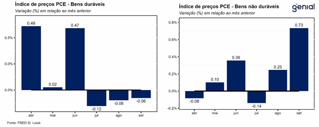 A composição mostra trajetórias bem divergentes entre a inflação de bens e a de serviços. Enquanto a primeira apresentou uma forte aceleração de 0,13% m/m para 0,46% m/m na passagem de agosto para setembro em decorrência da disparada no segmento de não-duráveis (0,73% m/m, ante 0,25% m/m), a segunda exibiu um arrefecimento considerável de 0,32% m/m para 0,18% m/m, em linha com o arrefecimento dos gastos com consumo das famílias. Com isso, a inflação de bens na métrica anual saiu de 0,86% a/a para 1,39% a/a, ao passo que a de serviços arrefeceu de 3,61% a/a para 3,43% a/a.