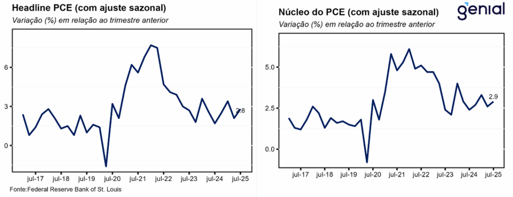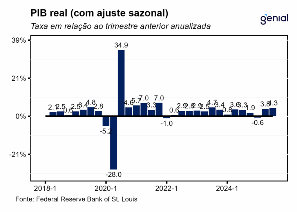 A primeira prévia do PIB dos EUA do 3º trimestre de 2025, que estava agendada inicialmente para o dia 30 de outubro, mas foi postergada por conta do shutdown do governo, veio muito acima da mediana das projeções dos analistas (3,3% t/t, Bloomberg), registrando uma alta anualizada de 4,3% t/t. Com esse resultado, o PIB agora se encontra 14,5 p.p. acima do patamar pré-pandemia (4ºtri/2019).
