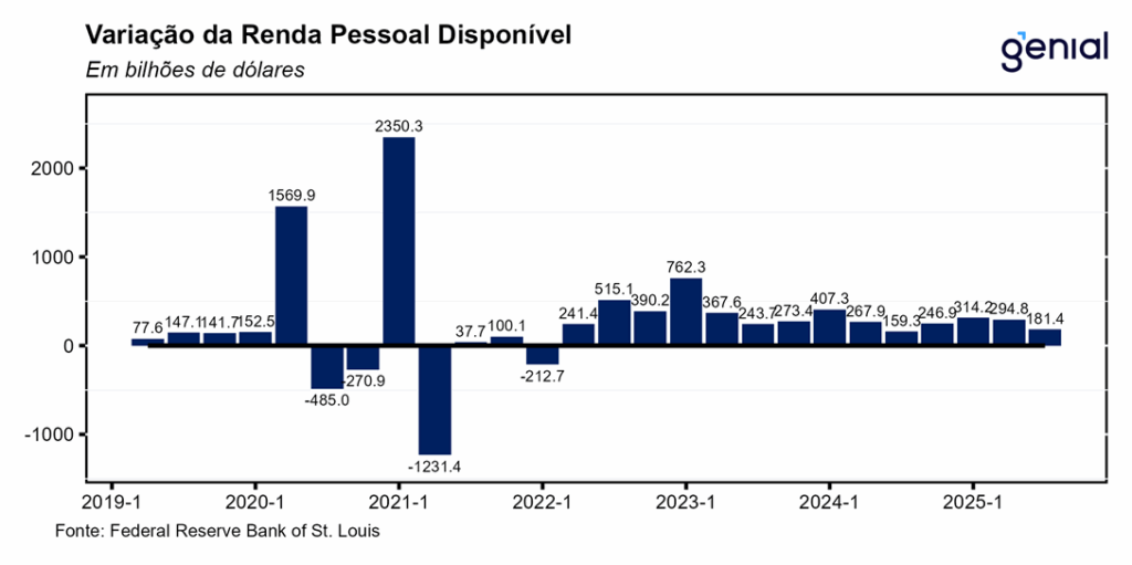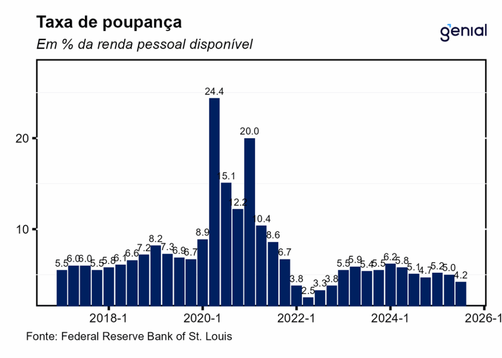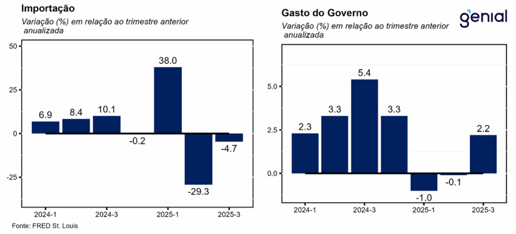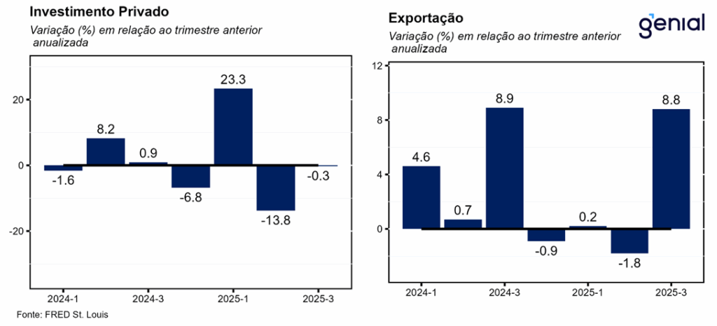 Os gastos com consumo pessoal foram o carro-chefe do crescimento econômico do 3º trimestre, aumentando 3,5% t/t na métrica trimestral anualizada, superando em muito a aceleração que era esperada em relação ao 2º trimestre (de 2,5% t/t para 2,7% t/t) e sendo responsável por 2,39 p.p. do resultado cheio do PIB no período (4,3% t/t). Depois de dois trimestres seguidos de alternância entre o consumo de bens e serviços por conta da decisão do governo de impor tarifas de importação, no 3º trimestre os gastos com consumo tanto de bens como de serviços apresentaram forte expansão (3,1% t/t e 3,7% t/t, com impactos de 0,66 p.p. e 1,74 p.p. respectivamente). No entanto, os bens duráveis apresentaram crescimento bem menor do que os não duráveis (1,6% t/t vs. 3,9% t/t) por conta das taxas de juros elevadas e do sentimento do consumidor ainda não ter se recuperado completamente, fatores esses que afetam muito mais o primeiro segmento do que o segundo.