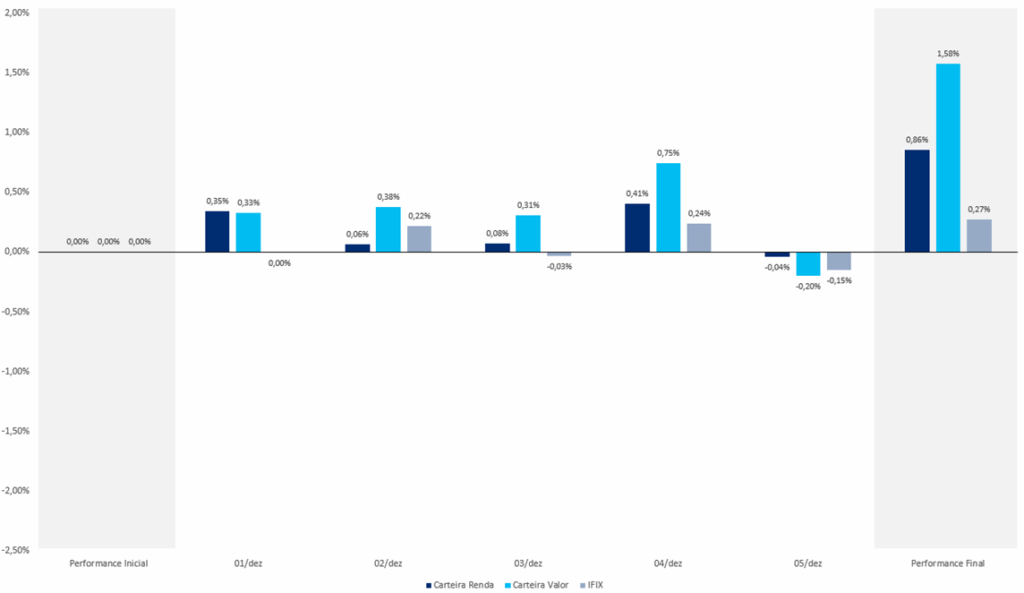 O destaque da semana na Carteira Valor foi o HGRE11, com alta de 3,44%. Na Carteira Renda, o melhor desempenho veio do RBRX11, que subiu 3,45%.