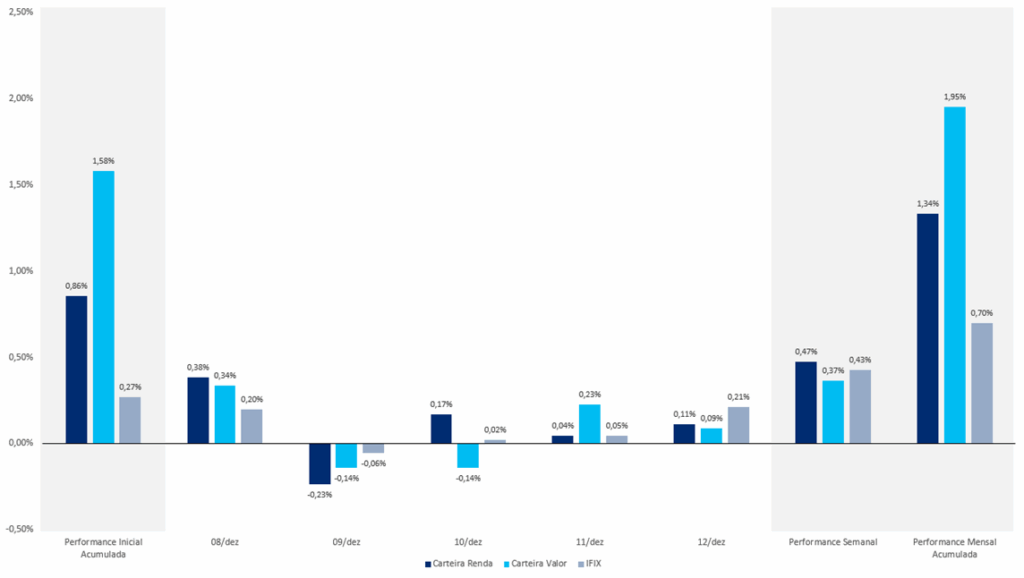 O destaque da semana na Carteira Valor foi o BTHF11, com alta de 1,34%. Na Carteira Renda, o melhor desempenho veio do RZAT11, que subiu 2,25%.