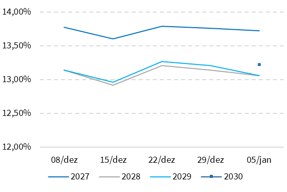 Nesta semana, a curva de juros futura apresentou oscilações ao longo dos prazos, com movimentos pontuais de alta seguidos por acomodação nos vértices intermediários e longos. O comportamento reflete a cautela do mercado diante de expectativas ainda estáveis para a taxa básica e de um cenário inflacionário mais controlado, o que limita um fechamento mais consistente da curva. Com isso, os prêmios de risco permanecem elevados nos vencimentos mais longos, enquanto os prazos curtos seguem mais ancorados pela política monetária atual. Saiba mais