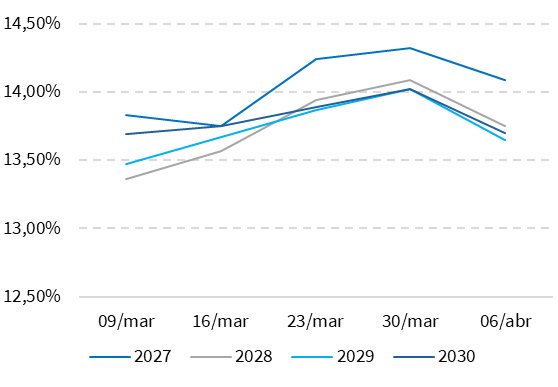 Nesta semana, a curva de juros futura apresentou fechamento, principalmente nos vencimentos mais longos, após a abertura observada nos dias anteriores. O movimento indica uma devolução parcial dos prêmios de risco, em linha com a melhora no ambiente externo e no comportamento das taxas internacionais. Ainda assim, o nível de juros segue elevado, refletindo a cautela do mercado diante das incertezas sobre inflação e política monetária. Saiba mais