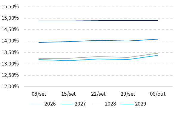 Na Zona do Euro, o dado mais relevante desta semana foi o IPCA de setembro, que acelerou para 2,2 % em relação ao ano anterior, ante 2,0 % em agosto. A elevação da inflação reforça que o Banco Central Europeu pode manter uma postura cautelosa quanto a cortes futuros, dado o risco de reprecificação de expectativas inflacionárias. Saiba mais