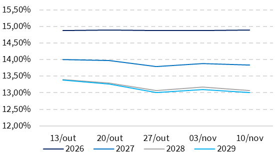 Na última semana, a curva de juros futura apresentou leve queda nos prazos mais longos, acompanhando a decisão do Banco Central de manter a Selic em 15% e o tom cauteloso sobre os próximos passos da política monetária. A atividade econômica mais fraca e a menor pressão inflacionária contribuíram para o recuo, embora as incertezas fiscais ainda mantenham os prêmios de risco elevados na parte longa da curva. Saiba mais