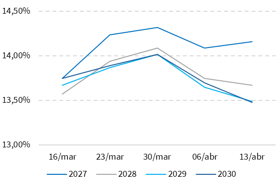 Na última semana, a curva de juros futura apresentou alta ao longo dos principais vencimentos, refletindo a pressão de uma inflação mais forte no Brasil e o avanço das taxas dos Treasuries. No entanto, após o movimento inicial de abertura, as taxas passaram a recuar, devolvendo parte dos prêmios de risco, especialmente nos prazos mais longos. Ainda assim, o nível de juros permanece elevado, indicando a cautela do mercado diante das incertezas sobre inflação e política monetária. Saiba mais