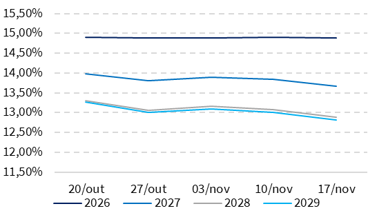 Nesta semana, a curva de juros futura apresentou queda, sobretudo nos prazos intermediários e longos, após a divulgação de uma inflação abaixo do esperado em outubro. O cenário de preços mais benignos reduziu os prêmios na parte longa da curva, enquanto os vencimentos curtos permaneceram estáveis, ainda ancorados pela Selic em 15%. Mesmo com o recuo, as incertezas fiscais e o ambiente externo seguem limitando movimentos mais amplos nos juros futuros. Saiba mais