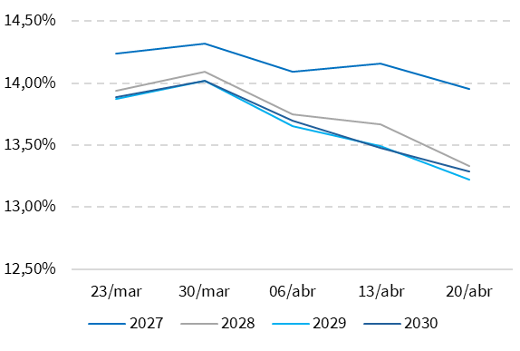 Na última semana, a curva de juros futura apresentou forte movimento de queda ao longo dos vencimentos, impulsionada pelo tombo do petróleo após a reabertura do Estreito de Ormuz. O alívio na commodity reduziu o prêmio de risco geopolítico embutido nas taxas, com os vencimentos curtos e intermediários liderando o movimento. As dúvidas sobre a durabilidade da trégua, contudo, contiveram parte dos ganhos e mantiveram as taxas em patamar ainda elevado, reforçando a cautela diante das incertezas sobre a trajetória da política monetária Saiba mais