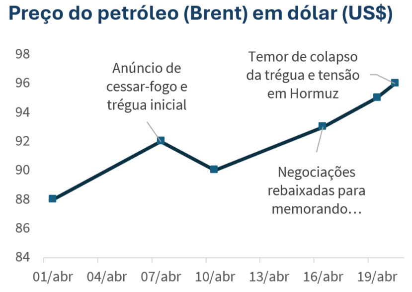 A tentativa de interromper a escalada entre Irã e EUA produziu até aqui menos uma pacificação e mais uma trégua operacional. O FMI classificou o cessar-fogo anunciado em 7 de abril como um passo relevante para a desescalada, mas a própria dinâmica das negociações mostra um arranjo ainda precário. Em 16 de abril, a Reuters reportou que os dois lados haviam reduzido a ambição de acordo amplo para um memorando temporário. O quadro voltou a se deteriorar com dúvidas sobre a continuidade das conversas, acusações e novo estresse em torno de Hormuz.